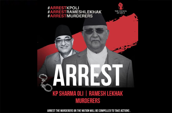 जेन–जी आन्दोलनलाई दमन गर्ने तत्कालिन प्रधानमन्त्री तथा एमाले अध्यक्ष केपी शर्मा ओली र कांग्रेस नेता तथा गृहमन्त्री रमेश लेखकलाई पक्राउ गर्नका लागि इन्टरनेटमा ट्रेण्ड शुरु गरिएको छ । हामी नेपालीका संयोजक सुदन गुरुङले एरेष्ट केपी ओली, एरेष्ट रमेश लेखक एण्ड एरेष्ट मडर्रर भन्दै ट्रेण्ड सुरु गरेका हुन् । राष्ट्रको लागि केही गर्न वा मर्न भन्दै उनले यो अभियान सुरु गरेका छन् ।